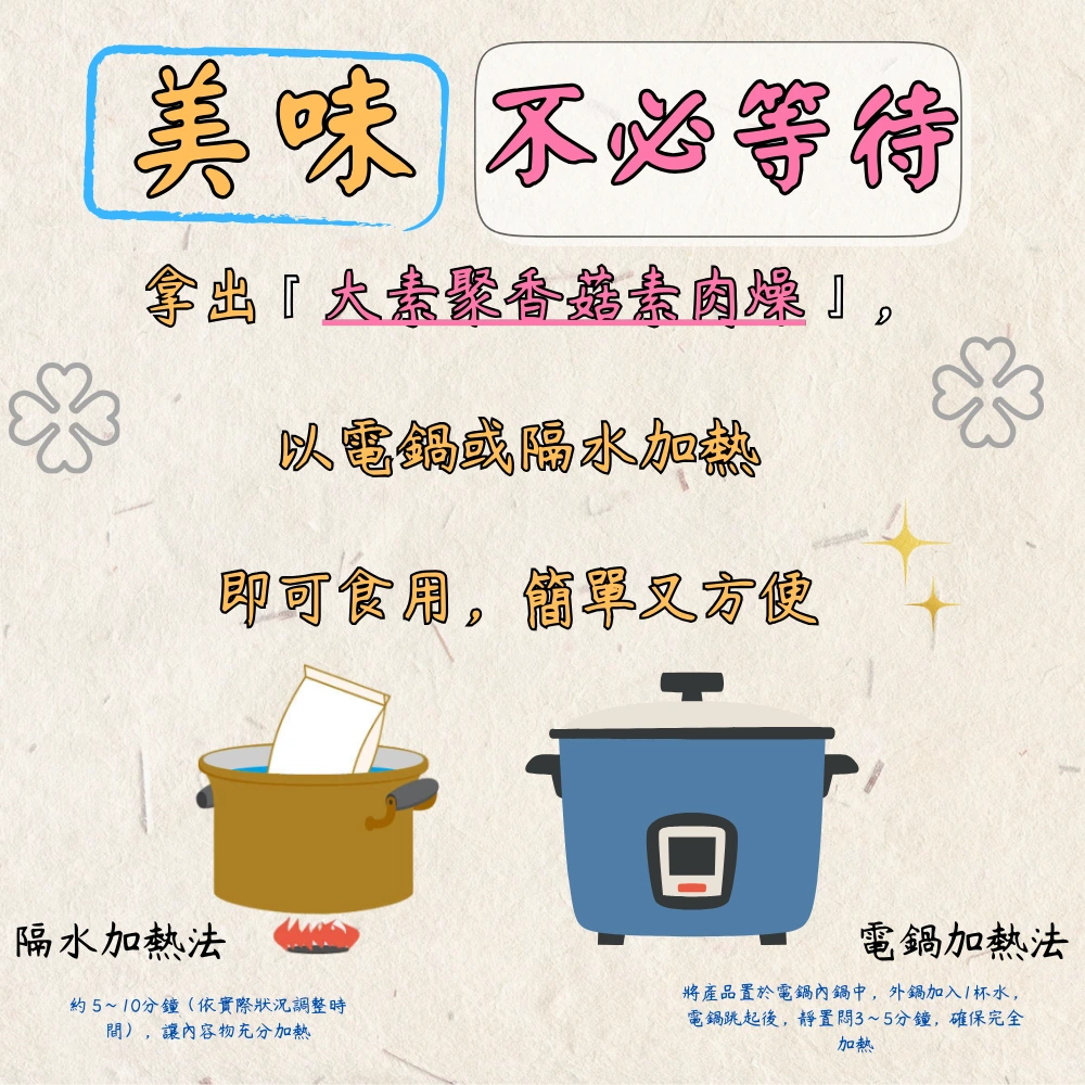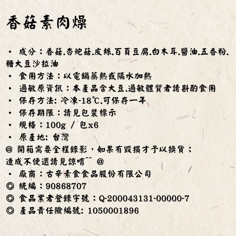 ‧ 成份:香菇.杏鮑菇.皮絲.百頁豆腐.白木耳.醬油.五香粉.糖大豆沙拉油