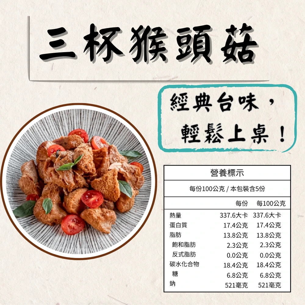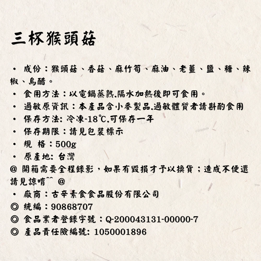 ‧ 成分:猴頭菇、香菇、麻竹筍、麻油、老薑、鹽、糖、辣椒、烏醋。