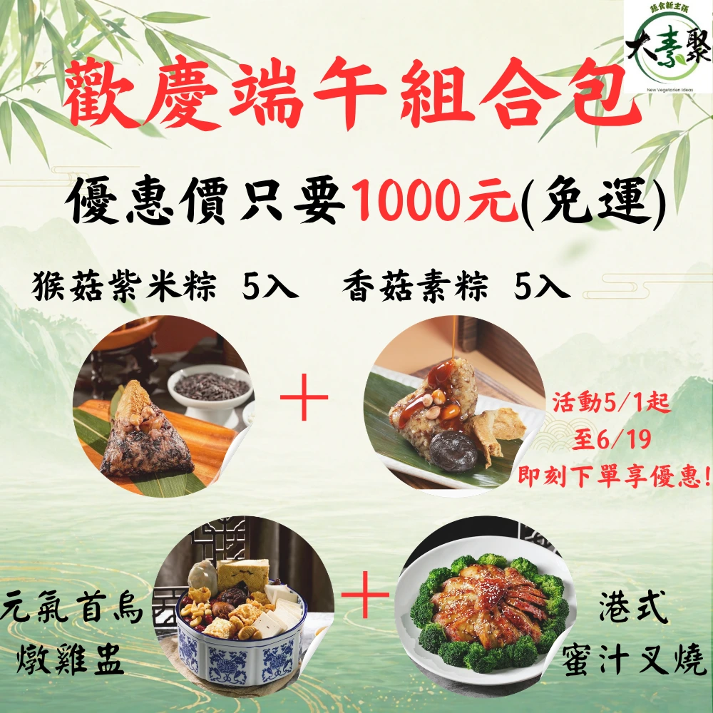 內含 香菇素粽5入*1 + 猴菇紫米粽 5入*1 + 首烏燉雞盅*1 + 港式蜜汁叉燒*1