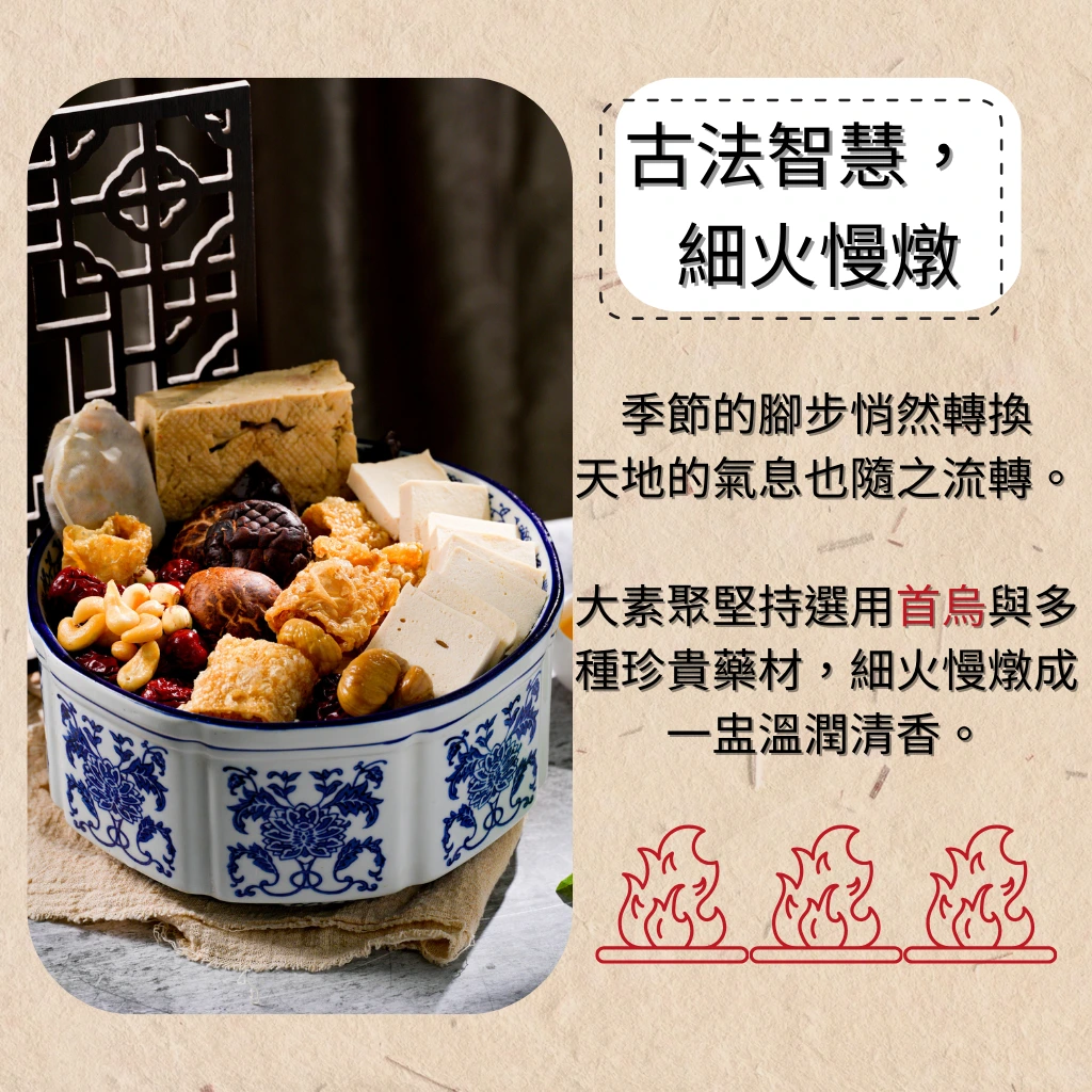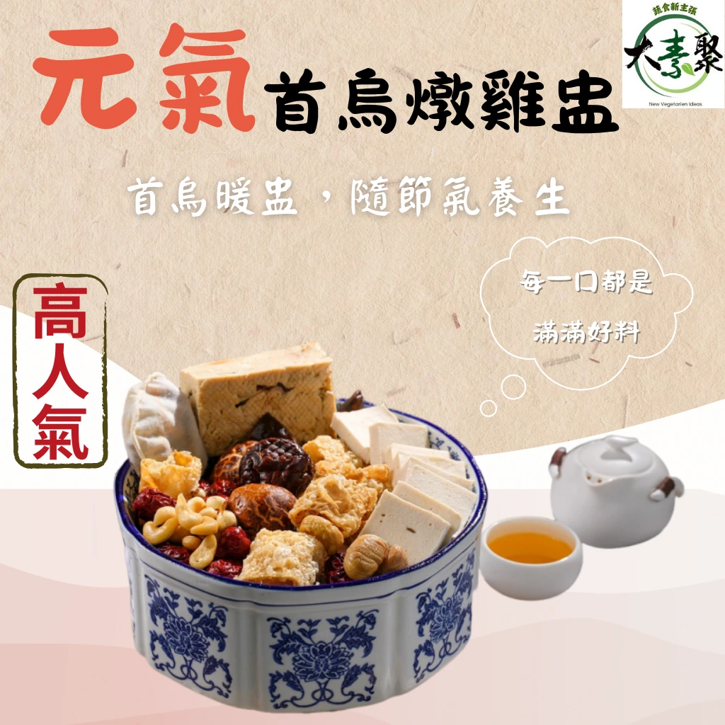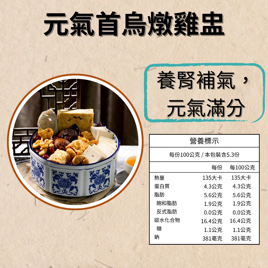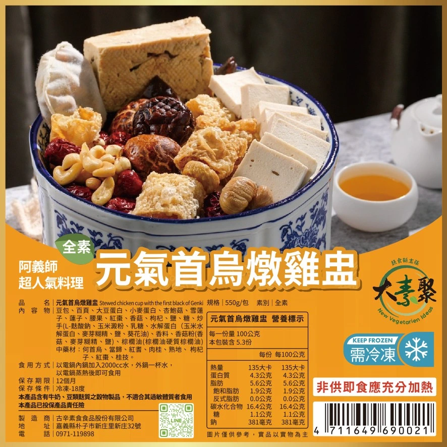 成份:百頁.大豆蛋白.小麥蛋白.杏鮑菇.豆包.蓮子.雪蓮子.腰果.紅棗.香菇.枸杞.鹽.糖.炒手(L-麩酸鈉,玉米澱粉.乳糖.水解蛋白(玉米水解蛋白.麥芽糊精,鹽,葵花油).香料.香菇粉(香菇,麥芽糊精,鹽).棕櫚油(棕櫚油硬質棕櫚油))中藥材: 何首烏.當歸.紅耆.肉桂.熟地. 枸杞子.紅棗.桂枝