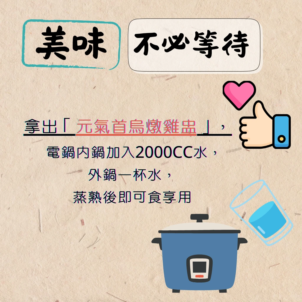 食用方法:電鍋:內鍋+2000CC水,外鍋1杯水,蒸熟後即可食用