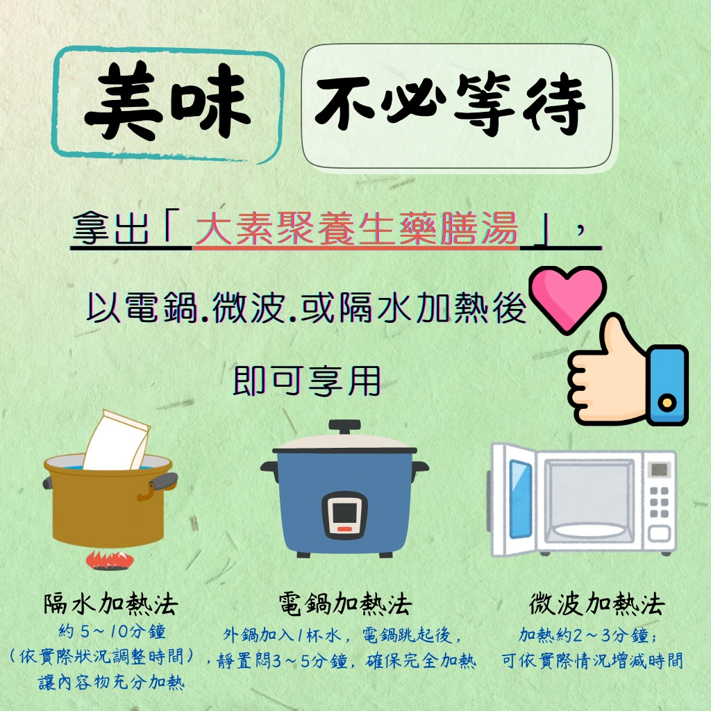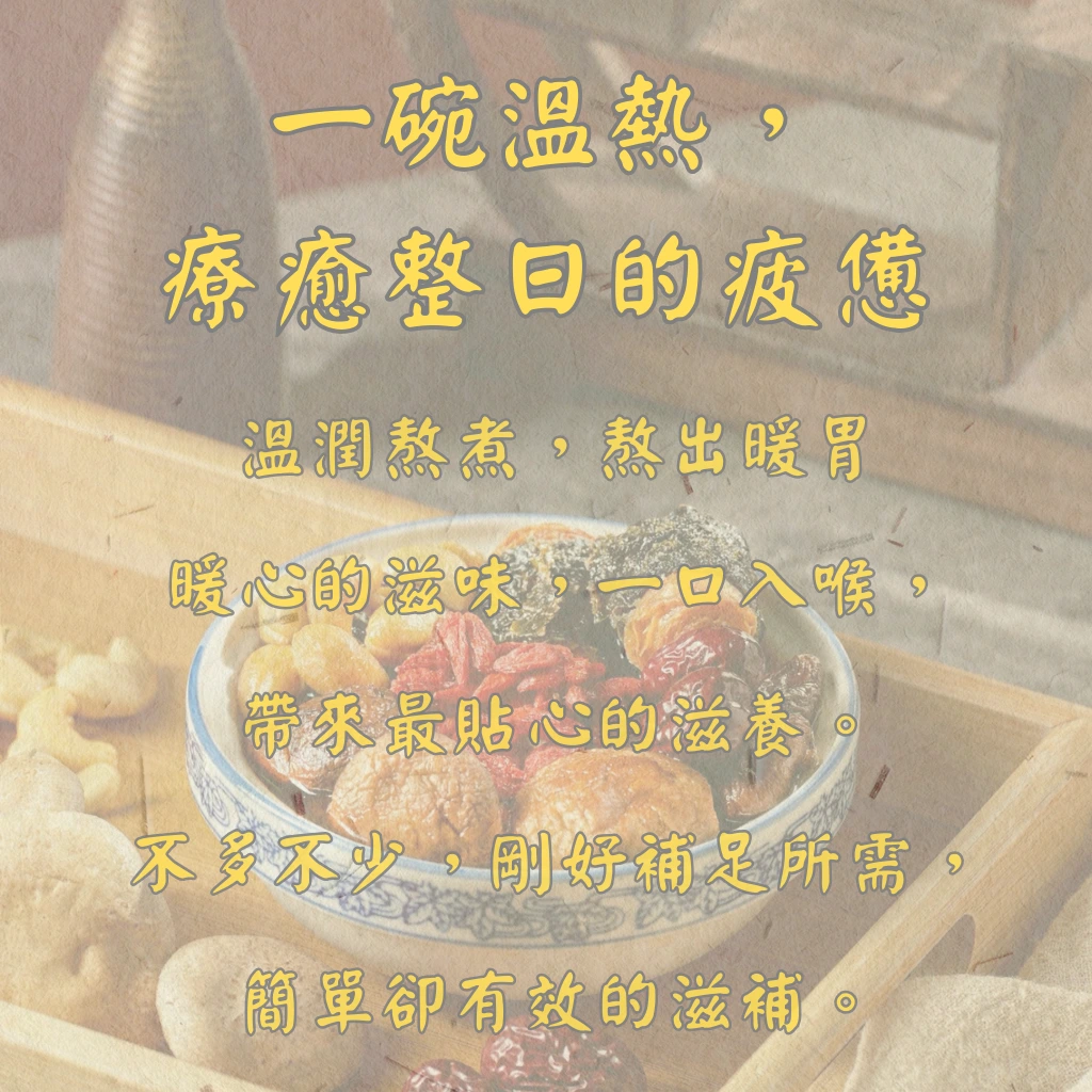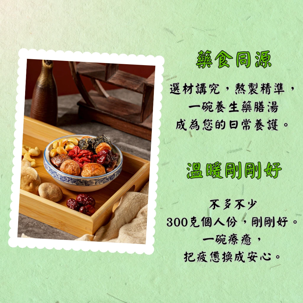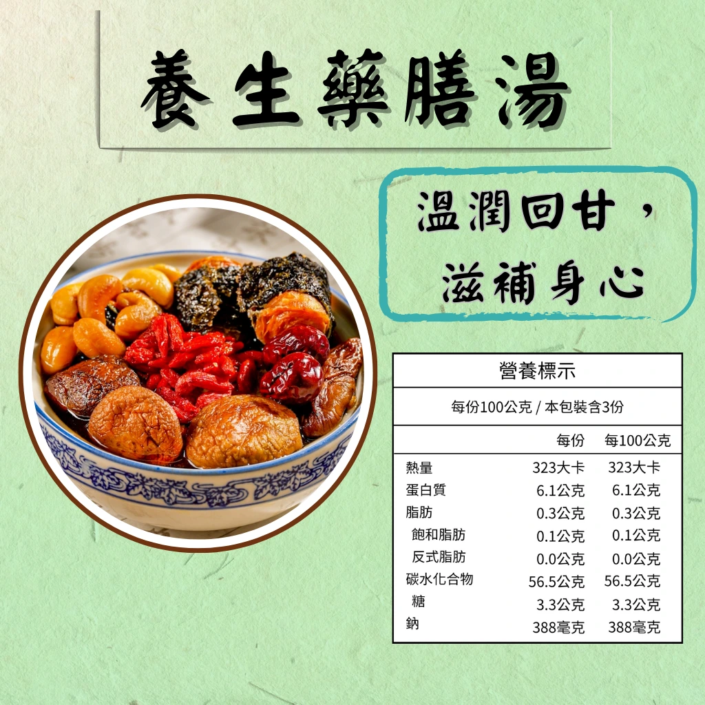 ‧ 成份:水.豆包.猴菇.山藥.麵腱.豆腸.秀珍菇.香菇.腰果.海苔.中藥包.枸杞.糖.鹽.蔬菜粉