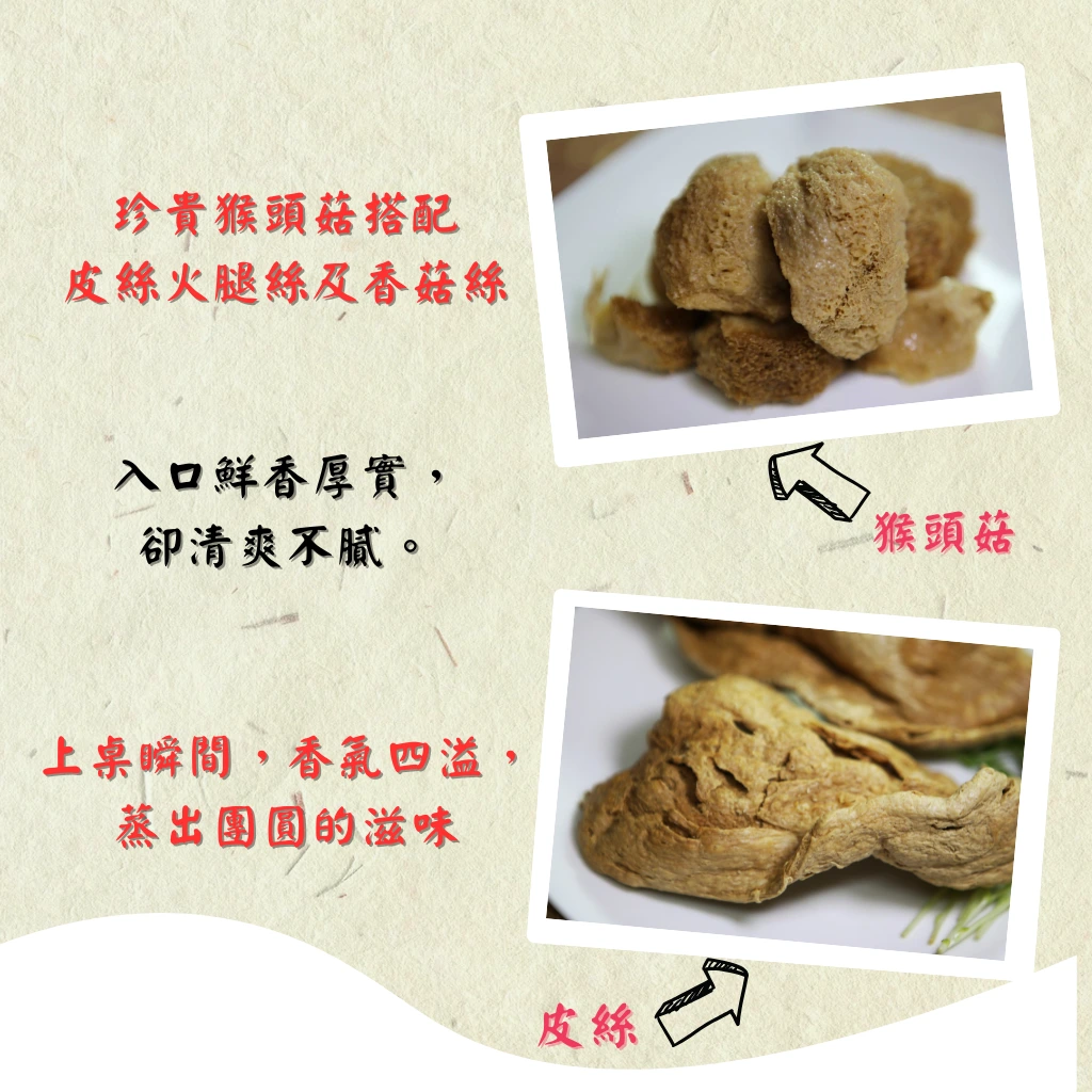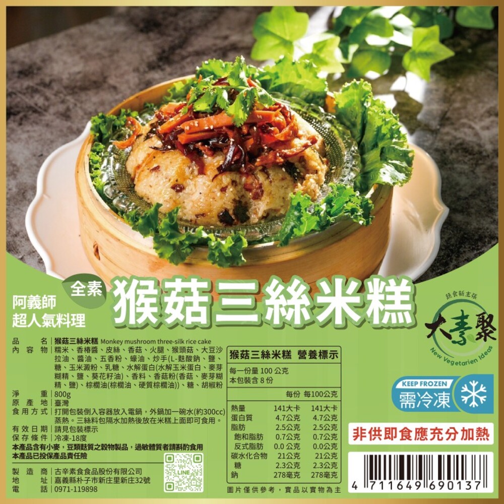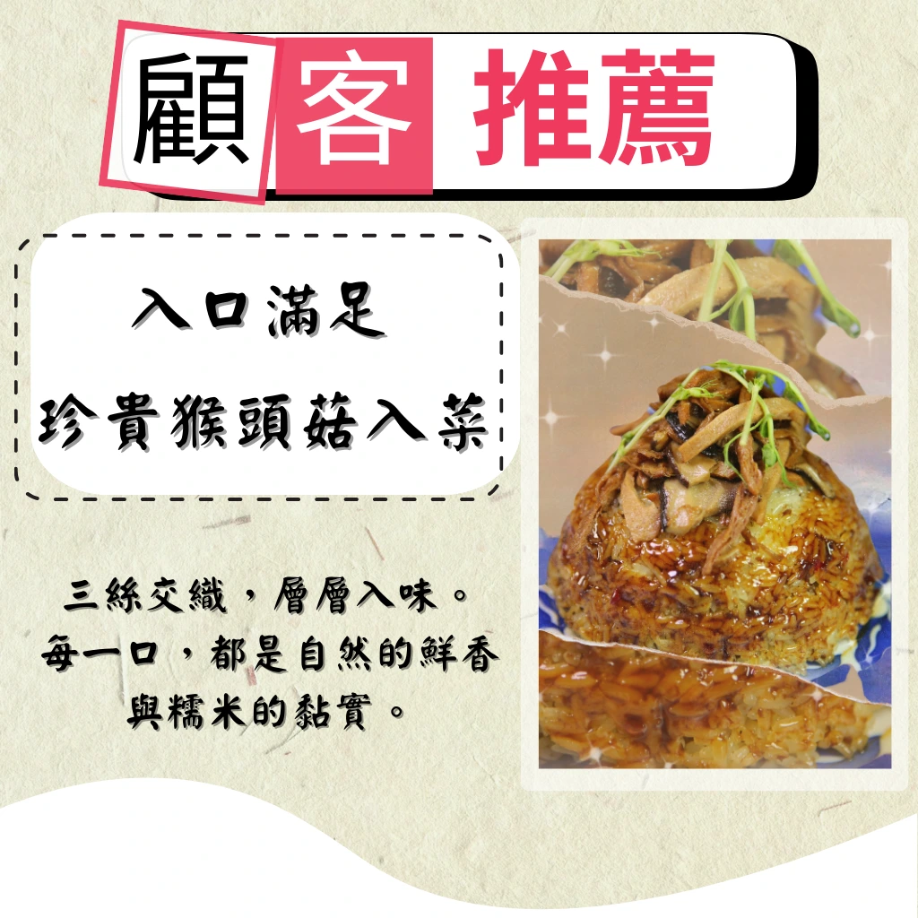 ‧ 成份:糯米、香椿醬、皮絲、香菇、火腿、猴頭菇、大豆沙拉油、醬油、五香粉、蠔油、炒手(L-麩酸鈉、玉米殿粉、水解蛋白(水解玉米蛋白、鹽、葵花籽油)、麥芽糊精、香料、香菇粉(香菇、麥芽糊精、鹽)、棕櫚油(棕櫚油、硬質棕櫚油))、糖、胡椒粉