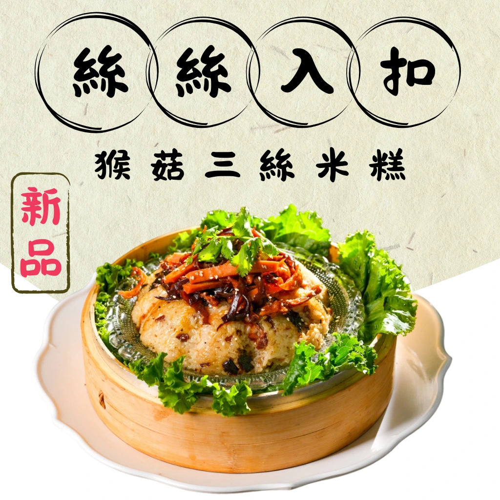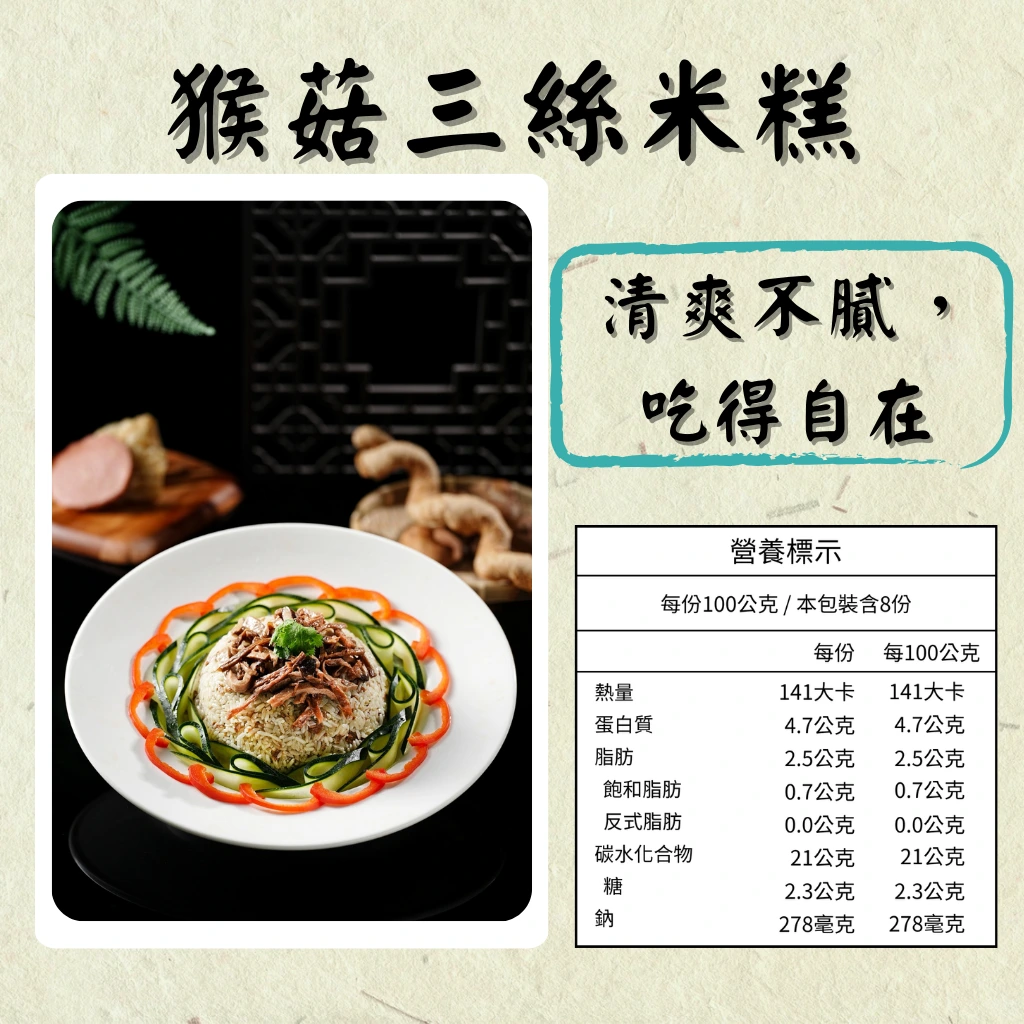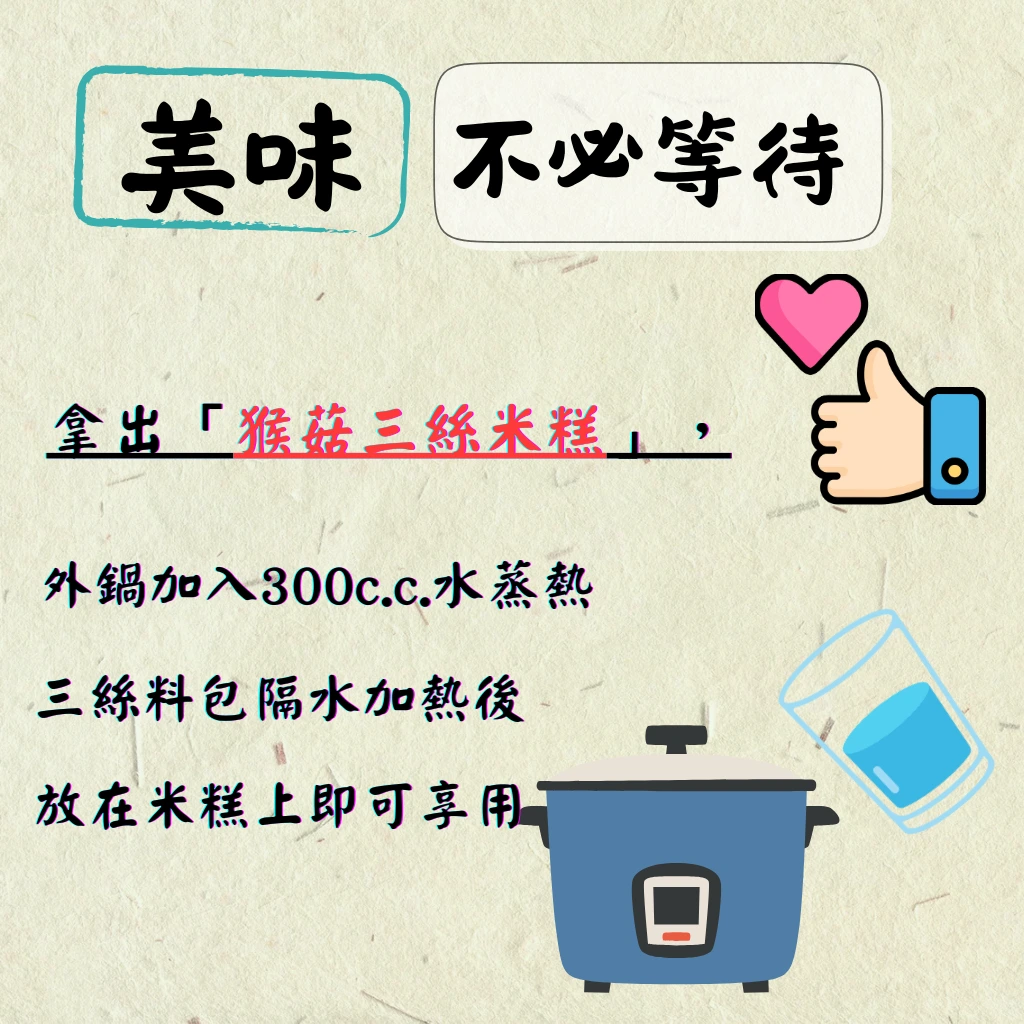 ‧ 食用方法:打開包裝倒入容器放入電鍋,外鍋加一碗水(約300cc)蒸熟。三絲料包隔水加熱後放在米糕上即可食用
