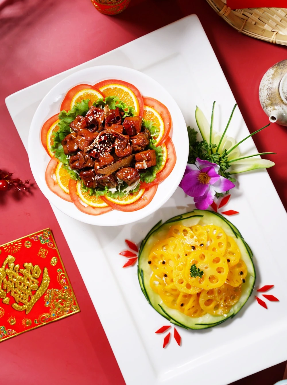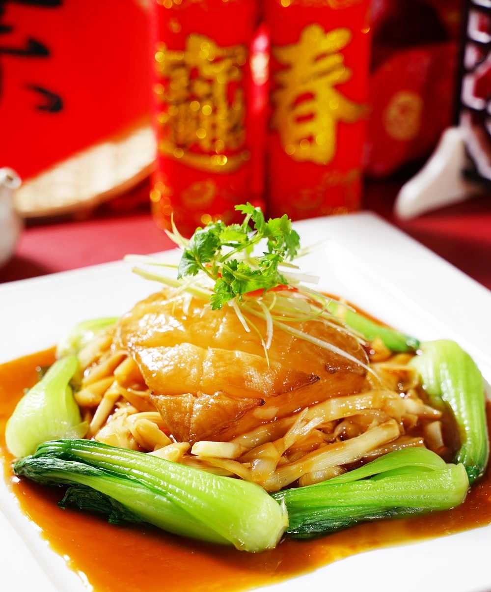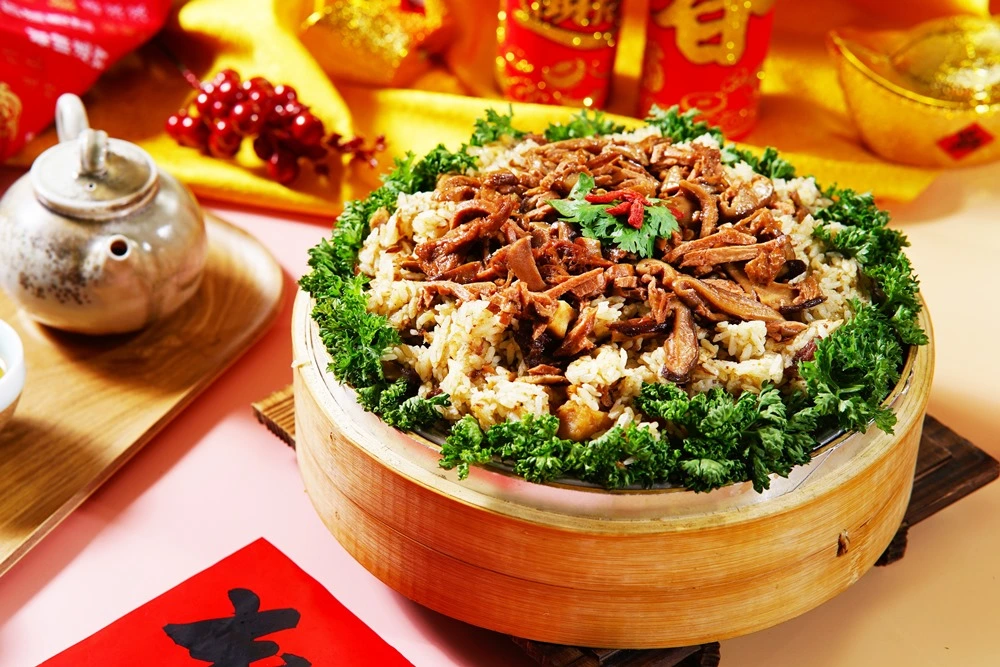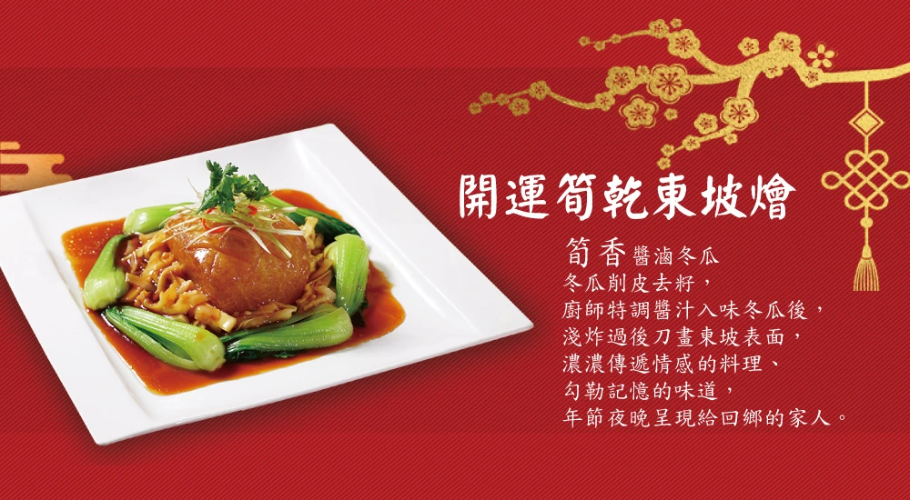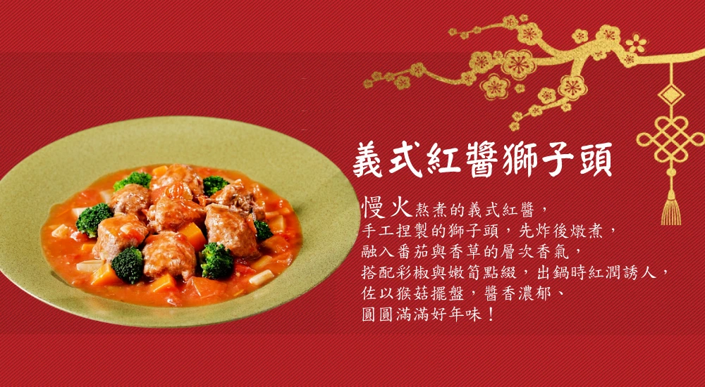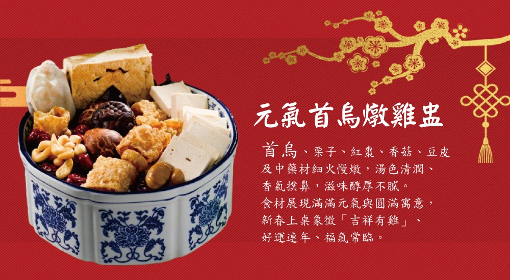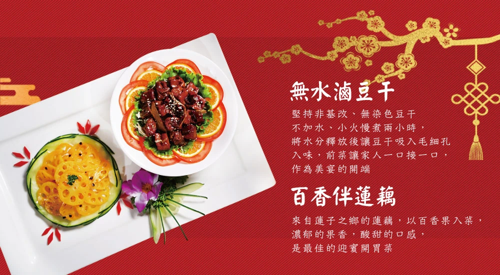 4.雙喜臨門冷盤拚成分蓮藕、百香果汁、非基改豆干、碧玉筍、老薑、辣椒、醬油、大豆沙拉油、糖、鹽/香菇素翅水雲羹成分大白菜、木耳、筍絲、豆包、紅蘿蔔、香菇絲、醬油、醋、素肉絲/三絲猴菇素米糕成分糯米、香椿醬、皮絲、香菇、火腿、猴頭菇、大豆沙拉油、醬油、五香粉、蠔油、炒手(L-麩酸鈉、鹽、糖、玉米澱粉、乳糖、水解蛋白 (水解玉米蛋白、麥芽糊精、鹽、葵花籽油)、香料、香菇粉 (香菇、麥芽糊精、鹽)、棕櫚油 (棕櫚油、硬質棕櫚油))、糖、胡椒粉/吉祥松露海鮮煲成分水、椰奶、大白菜、南瓜、皇帝豆、素蝦仁、素花枝、杏鮑菇、醋酸澱粉、蔬菜粉、百里香、松露風味橄欖油、鹽/元氣首烏燉雞盅成分百頁、大豆蛋白、小麥蛋白、杏鮑菇、豆包、蓮子、雪蓮子、腰果、紅棗、香菇、枸杞、鹽、糖、炒手(L-麩酸鈉,玉米澱粉、乳糖、水解蛋白(玉米水解蛋白、麥芽糊精,鹽,葵花油),香料,香菇粉(香菇,麥芽糊精,鹽),棕櫚油(棕櫚油硬質棕櫚油))中藥材: 何首烏 當歸 紅耆、肉桂、熟地、 枸杞子、紅棗、桂技/ 義式紅醬獅子頭成分水、素肉塊(非基因改造大豆蛋白、小麥澱粉、小麥蛋白、碳酸☆、硫酸鈣)、非基因改造大豆蛋白、大豆沙拉油、紅蘿蔔、木耳、西洋芹、黏稠劑(乙醯化磷酸二澱粉)、砂糖、食鹽、醬油、香菇素蠔油(水、轉化液糖(蔗糖、水)、☆脂大豆片、酵母抽出物、香菇粉)、酵素製劑(麥芽糊精、麩醯胺轉胺酶)、白胡椒粉、番茄醬、義大利香料、砂糖、蔬菜粉、玉桂葉、百里香/開運筍乾東坡燴成分水、筍乾、冬瓜、香菇、沙茶醬、蠔油、糖、沙拉油、八角、蔬菜粉、鹽/ 八寶芋泥賀新歲成分黑糯米、黑芝麻、大麥仁、燕麥、桂圓、紅豆、綠豆、糖、芋頭、椰奶、奶油