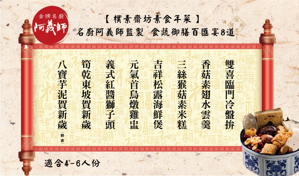【樸素齋坊素食年菜】 名廚阿義師監製 食蔬御膳百匯宴(8道)