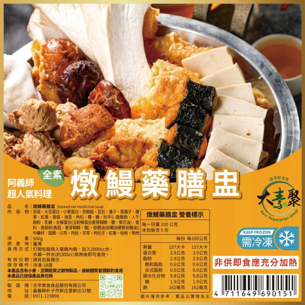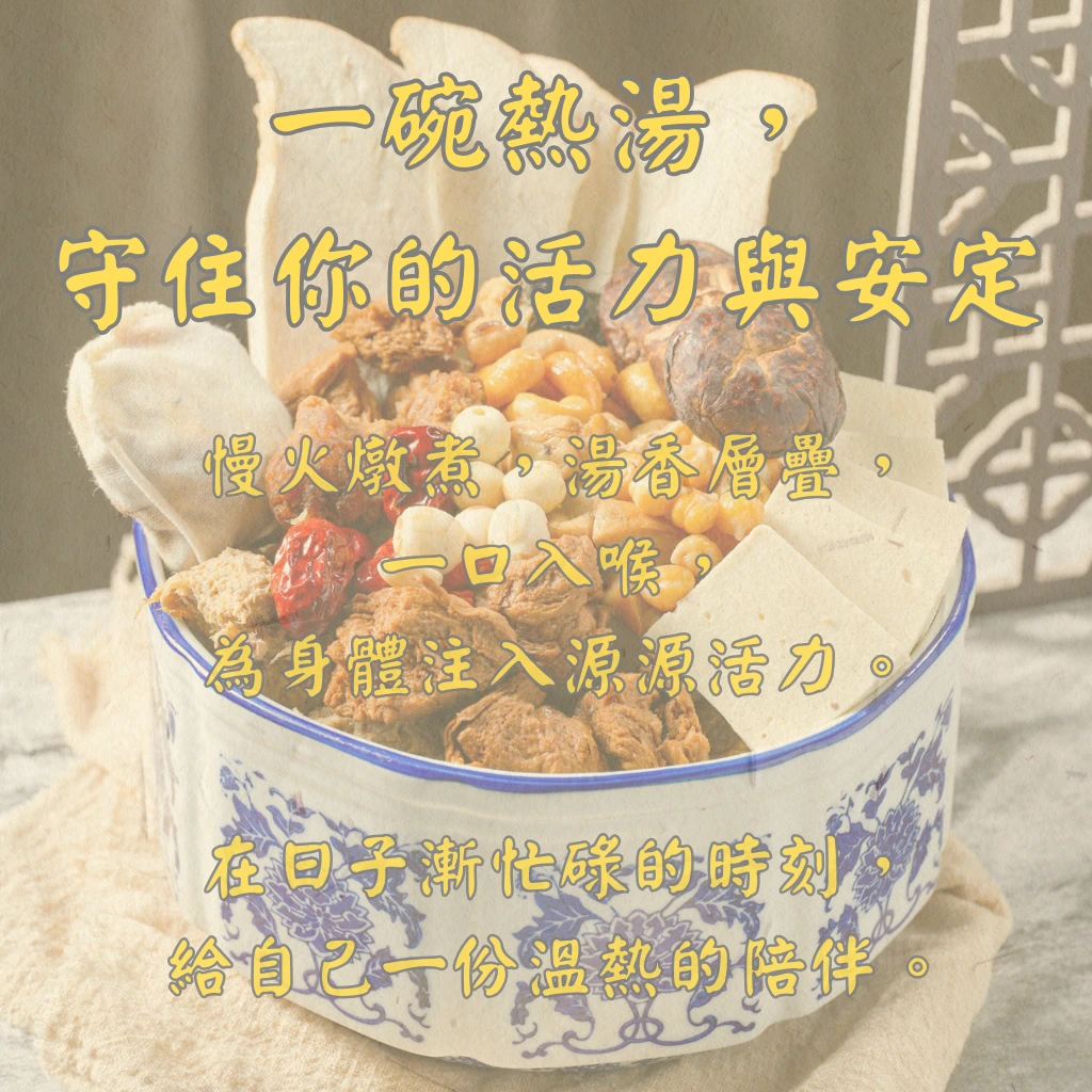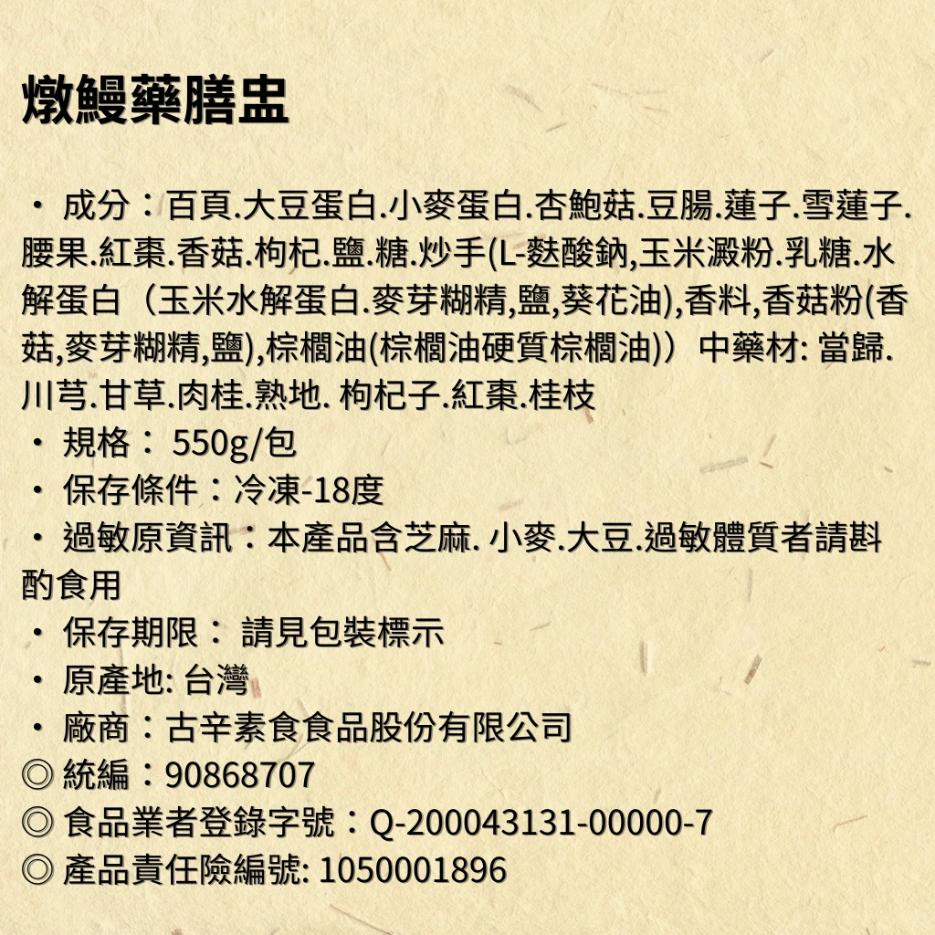 ‧ 成分:百頁.大豆蛋白.小麥蛋白.杏鮑菇.豆腸.蓮子.雪蓮子.腰果.紅棗.香菇.枸杞.鹽.糖.炒手(L-麩酸鈉,玉米澱粉.乳糖.水解蛋白(玉米水解蛋白.麥芽糊精,鹽,葵花油),香料,香菇粉(香菇,麥芽糊精,鹽),棕櫚油(棕櫚油硬質棕櫚油))中藥材: 當歸.川芎.甘草.肉桂.熟地. 枸杞子.紅棗.桂枝
