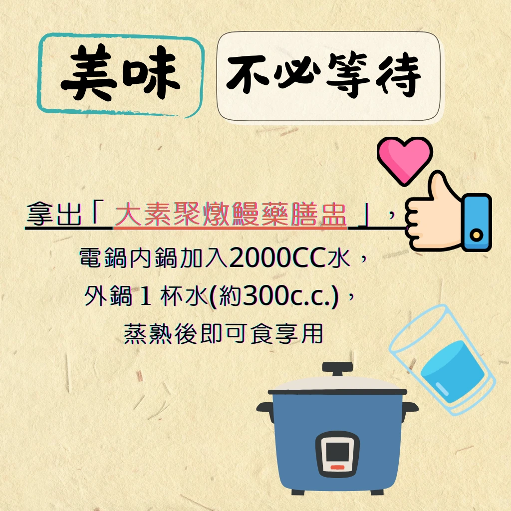 ‧ 食用方法: 電鍋:內鍋+2000CC水,外鍋1杯水(約300c.c.),蒸熟後即可食用