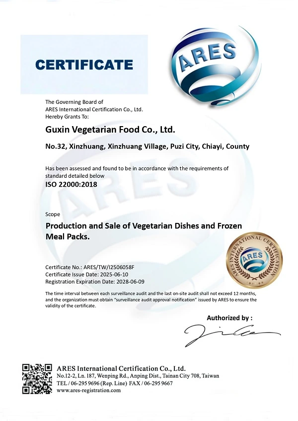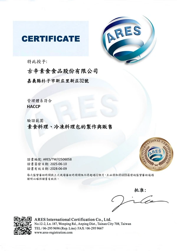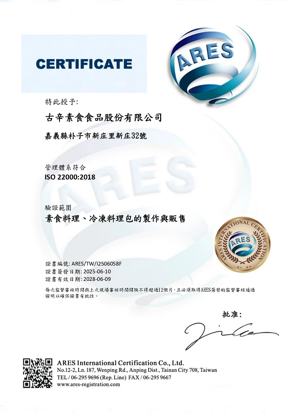 大素聚秉持「用心做素食、健康無負擔」的品牌理念,長期致力於提供安全、健康、美味的素食產品。為了讓消費者享有更高規格的食品安全保障,我們積極導入國際管理制度,並於近期正式通過 ISO 22000:2018 與 HACCP 食品安全管理系統雙重認證!